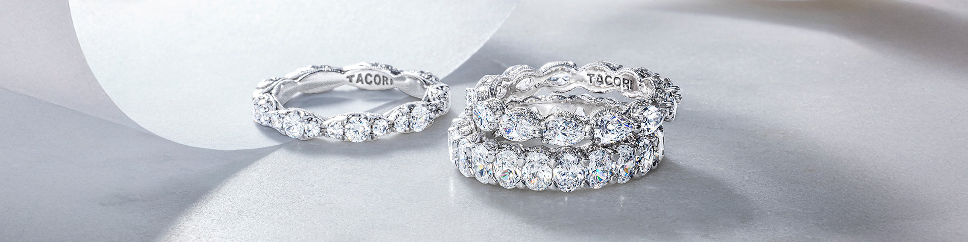 Tacori wedding rings are handcrafted in California, known for their signature crescent detailing and exceptional attention to detail. Every ring is made by master artisans, blending classic design with intricate hand-finished touches that create a distinctive silhouette. From diamond eternity bands to polished metal styles, Tacori wedding rings offer a balance of timeless craftsmanship and modern elegance. Each piece is designed to complement the engagement ring while standing beautifully on its own.