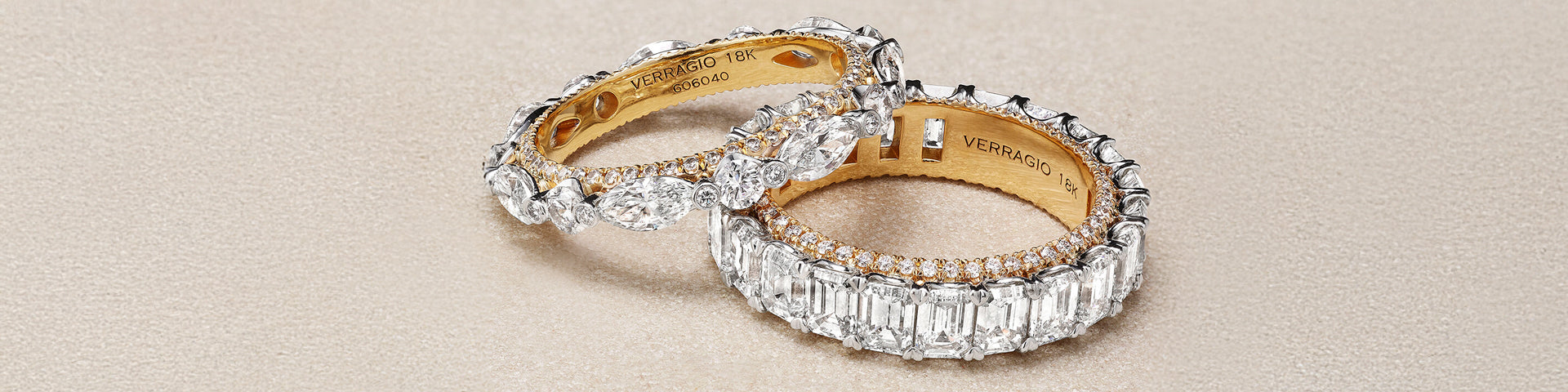 Verragio wedding rings are crafted with the same attention to detail and design as the brand’s signature engagement styles. Founded by designer Barry Verragio and based in New York, the brand offers wedding bands that feature signature elements like scrollwork, beading, and the patented Lumino setting. Collections such as Parisian, Venetian, and Couture include coordinating bands that can be customized in white, yellow, or rose gold, as well as platinum. Designed to work seamlessly alongside Verragio engagement rings or worn on their own, these bands carry the same level of craftsmanship and visual identity.