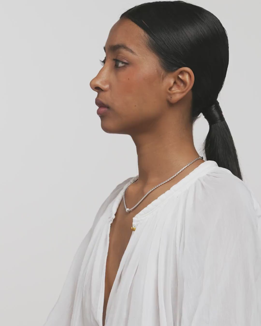From the Eka Collection, this 18K white gold box chain necklace features a central station set with 0.19 carats of natural round pavé diamonds. Designed at 17 inches with a lobster claw clasp, it combines sleek modern form with subtle radiance.