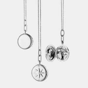 The Monica Rich Kosann “Adventure” Compass Locket Necklace in sterling silver is a symbol of direction and discovery. Accented with round white sapphires totaling 0.033 carats, this finely crafted locket opens to hold two cherished photos, serving as a keepsake for life’s journeys. Suspended from an 18-inch sterling silver chain, it’s an elegant blend of sentiment and sophistication.