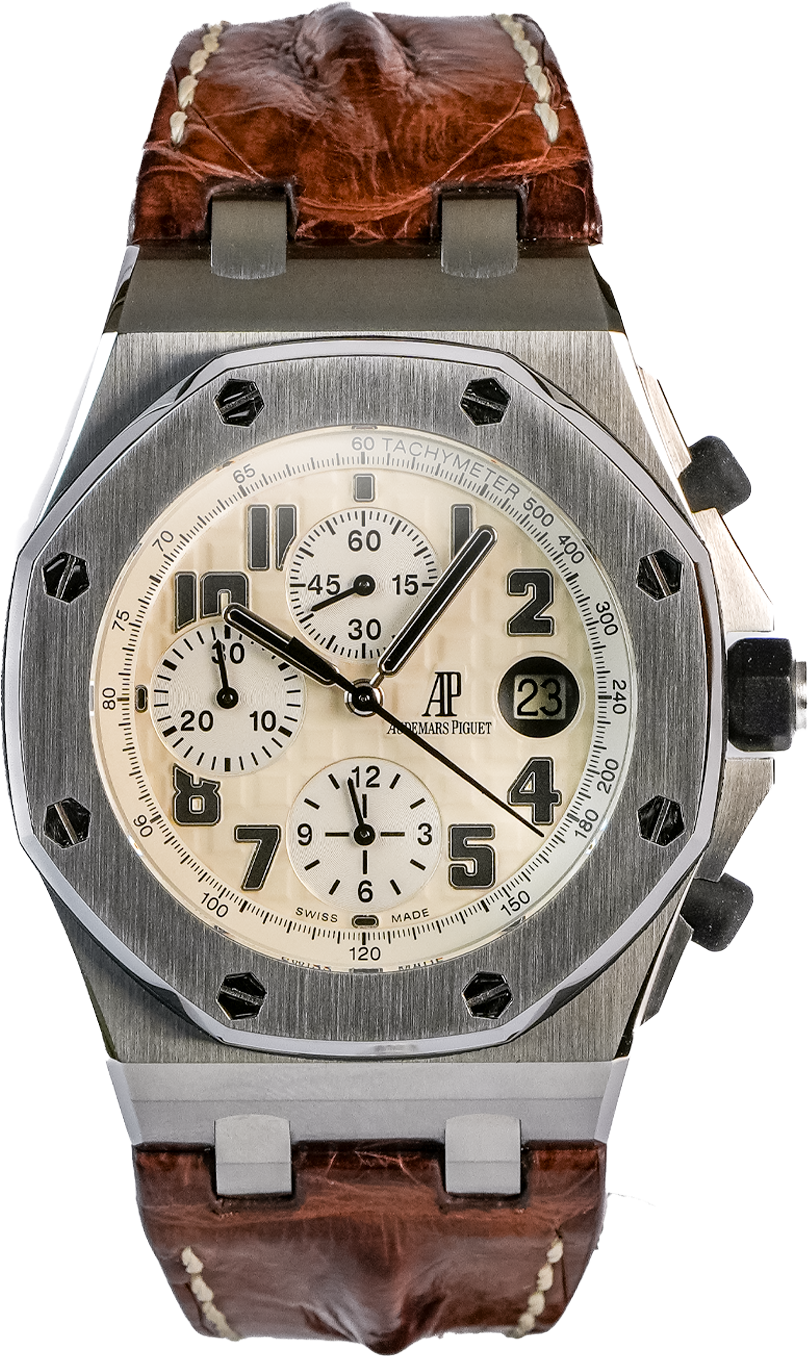 The Audemars Piguet Royal Oak Offshore Chronograph Ref. 26170ST features the bold 42 mm Offshore case in stainless steel with the collection’s signature octagonal bezel and exposed hexagonal screws. This example carries the beige and white “Méga Tapisserie” dial configuration with contrasting chronograph subdials and date display at 3 o’clock, a layout that defines the early Offshore chronograph generation. The combination of brushed and high-polish finishing across the case and bezel highlights the angular architecture that makes the Offshore distinct within the Royal Oak family.