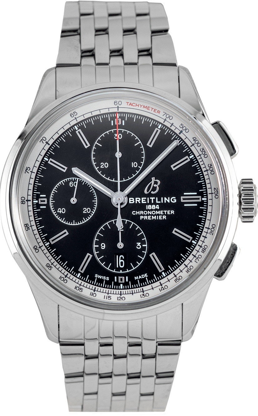 The Breitling Premier Chronograph 42mm takes inspiration from the refined 1940s Premier line that combined sophistication with performance. Its polished and brushed stainless-steel case, black sunburst dial, and balanced chronograph layout give it a modern yet timeless appeal. Powered by the automatic Breitling Calibre 13, it offers chronometer-certified precision, 48-hour power reserve, and water resistance up to 100 meters.