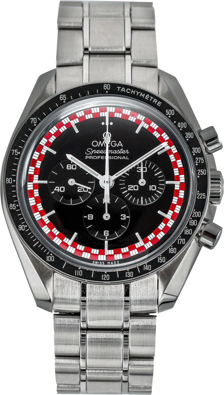 The OMEGA Speedmaster “Tin Tin” pays tribute to the rocket design from the classic comic series and is one of the most collectible modern Speedmasters. Its red and white outer minute track and black dial distinguish it from standard Moonwatch models. The 42 mm stainless steel case houses the hand-wound Calibre 1861 under a hesalite crystal with a tachymeter bezel, honoring the brand’s historic space legacy.