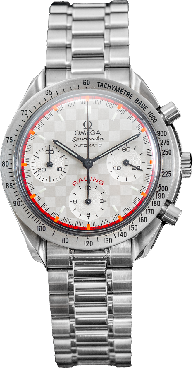 The Omega Speedmaster Reduced Schumacher Racing Ref. 3517.30.00 is part of Omega’s motorsport-focused Schumacher series produced during the brand’s partnership with Michael Schumacher. The watch features a 39 mm stainless steel case paired with a tachymeter bezel, maintaining classic Speedmaster proportions in a more compact size. What distinguishes this reference is its silver checkerboard dial texture, contrasting black chronograph subdials, red outer minute track, and Racing text printed above the six o’clock subdial. These design elements reflect Omega’s late 1990s and early 2000s racing aesthetic and clearly set it apart from standard Speedmaster Reduced models. Powered by an automatic chronograph movement, this reference remains a sought-after example from the Schumacher era.