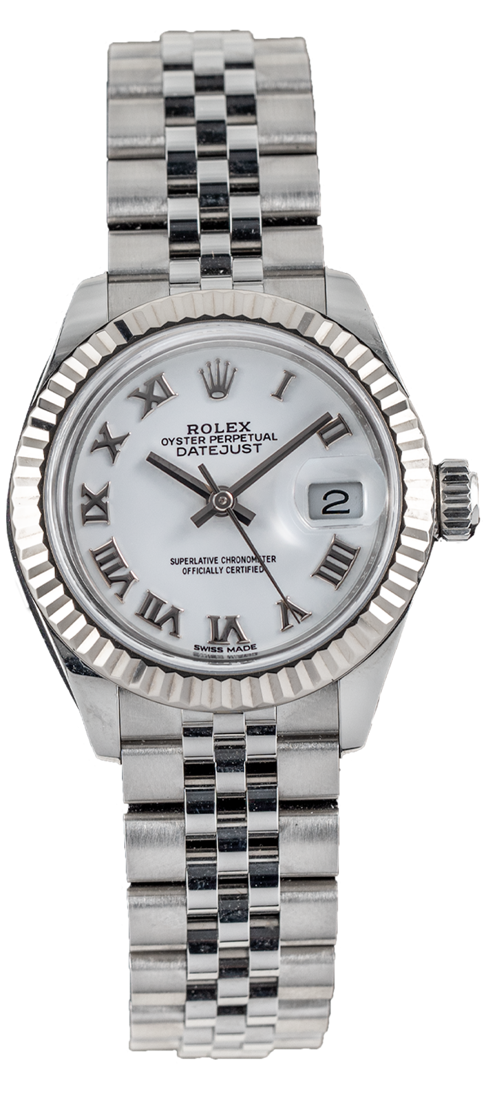 The Rolex Lady-Datejust 28mm (Ref. 279174) reflects the timeless elegance of the Datejust line in a refined modern form. Its combination of stainless steel and 18K white gold features a fluted bezel and a crisp white dial with Roman numerals. Powered by the Rolex Calibre 2236 automatic movement, this model delivers superior accuracy and reliability with a 55-hour power reserve. The Oyster case and Jubilee bracelet offer comfort and versatility, embodying the sophistication that defines contemporary Rolex design.