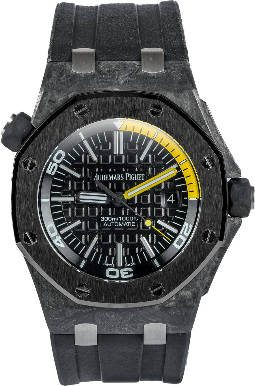 Condition Notes: This Audemars Piguet Royal Oak Offshore Ref. 1.7.2012 is in very good pre-owned condition overall. The forged carbon case and black bezel remain in very good condition with minimal visible wear. Light scratches are present on the titanium caseback. The rubber strap is functional; however, the strap keepers that secure the excess strap are beginning to crack slightly from age. No box and no papers included. Year 2012.