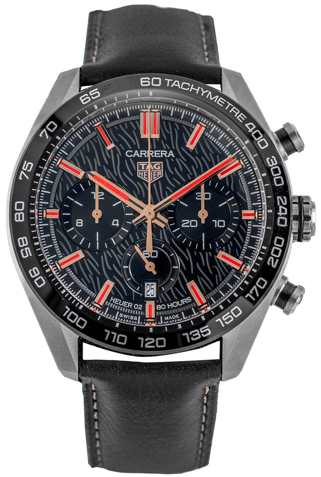 Created for the Lunar New Year, the Carrera “Year of the Rabbit” is a numbered limited edition of 500 pieces. The striped dial, red highlights, and gold-toned hands and markers nod to traditional New Year colors while keeping the modern Carrera profile that collectors recognize. The 44 mm steel case features a fixed ceramic tachymeter bezel and a black calfskin strap. Inside is the in-house Heuer 02 automatic chronograph with an 80-hour power reserve and 100 m water resistance.