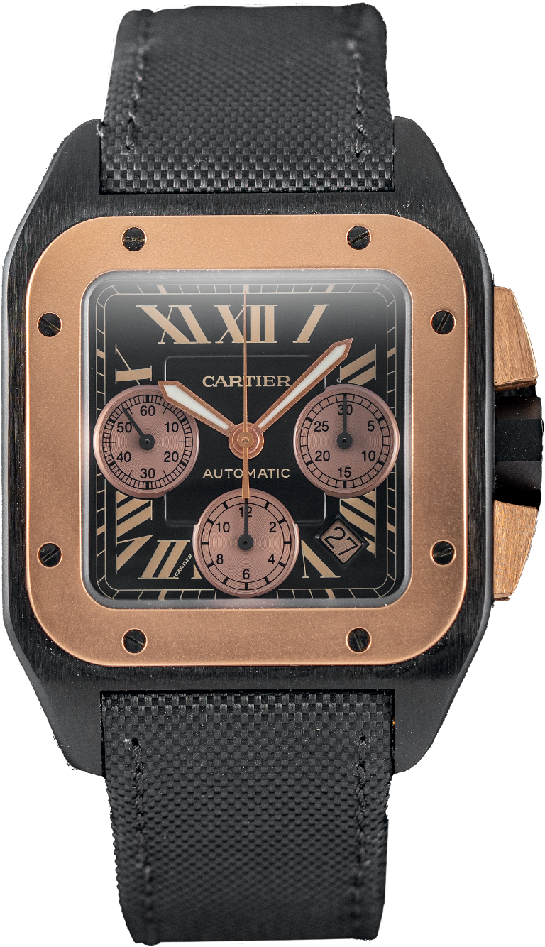 The Cartier Santos 100 XL Ref. W2020004 is an extra-large execution of Cartier’s iconic Santos 100 collection, known for its bold, angular case and exposed bezel screws that emphasize both heritage and presence on wrist. The substantial ALDC coated titanium case measures approximately 54.9 × 46.55 mm, giving it a commanding silhouette compared with standard Santos models. The dial layout features classic Cartier Roman numerals and sword-style hands, paired with strong contrast and a sporty character suited to everyday wear. This example is fitted with a black textile strap that softens the large case profile while maintaining a cohesive look.