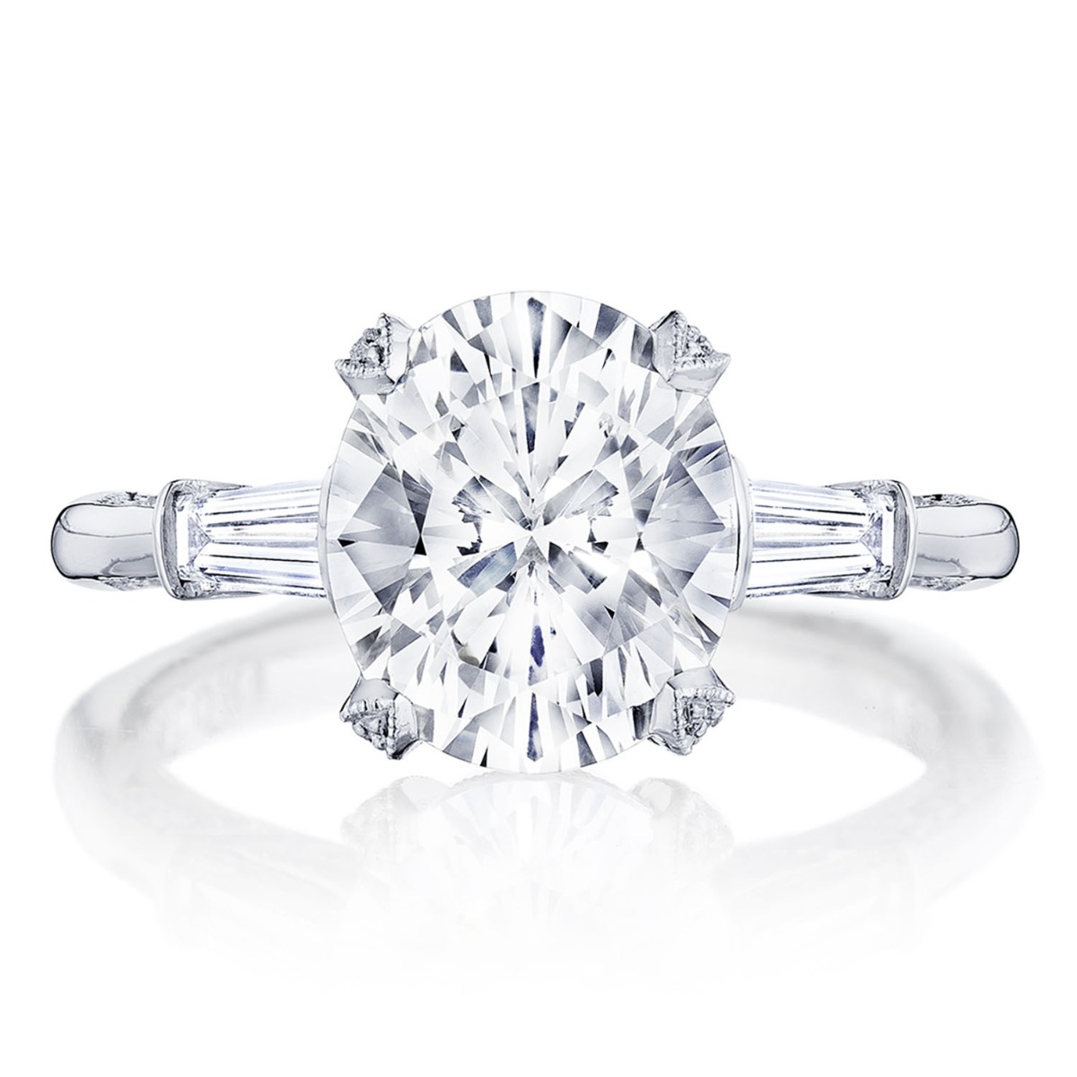 Two baguette diamonds frame the center stone, which sits on a diamond-intense Cathedral foundation with a hidden bloom and diamond-studded prongs. Simply Tacori crescent fabric decorates the innerface and complements the high-polish ceiling.