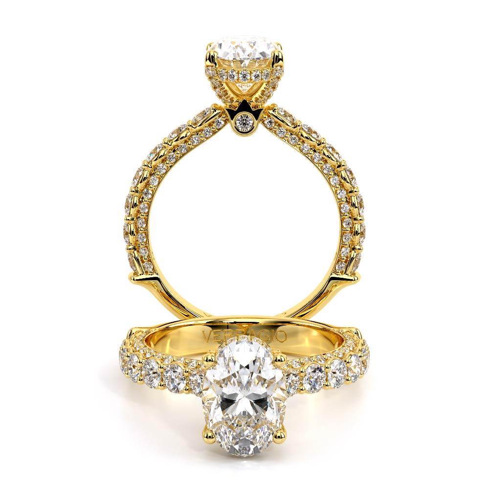 Couture-0489OV-2.5 is an elevated four-prong engagement ring featuring a diamond-bridge head designed to highlight your center stone. Meticulously-set round diamonds in a shared-prong setting wrap the elegant shank, enhanced with a pave-set three-quarter diamond riviera. The Verragio signature crest completes the statement look.