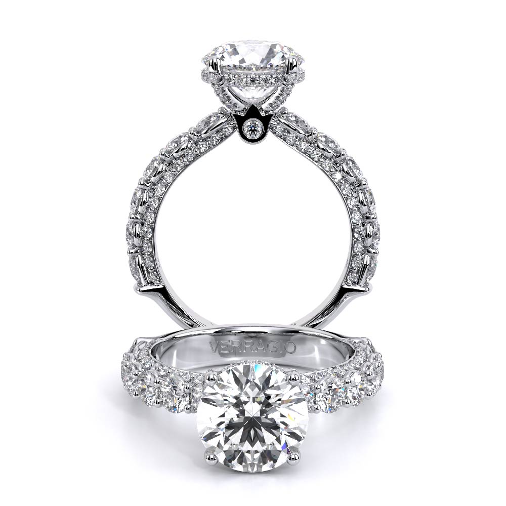 Couture-0489R-3.0 is an elevated four-prong engagement ring featuring a diamond-bridge head designed to highlight your center stone. Meticulously-set round diamonds in a shared-prong setting wrap the elegant shank, enhanced with a pave-set three-quarter diamond riviera. The Verragio signature crest completes the statement look.