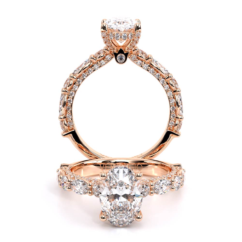 Couture-0490OV-2.5 is an elevated four-prong engagement ring featuring a diamond-bridge head designed to highlight your center stone. Meticulously-set alternating round and marquise diamonds in a shared-prong setting wrap the elegant shank, enhanced with a pave-set three-quarter diamond riviera. The Verragio signature crest completes the statement look.