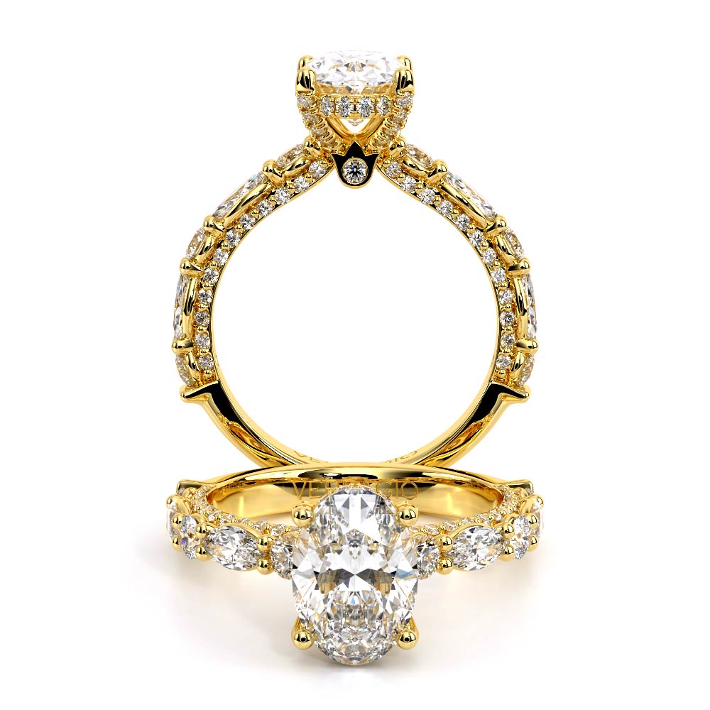Couture-0490OV-2.5 is an elevated four-prong engagement ring featuring a diamond-bridge head designed to highlight your center stone. Meticulously-set alternating round and marquise diamonds in a shared-prong setting wrap the elegant shank, enhanced with a pave-set three-quarter diamond riviera. The Verragio signature crest completes the statement look.
