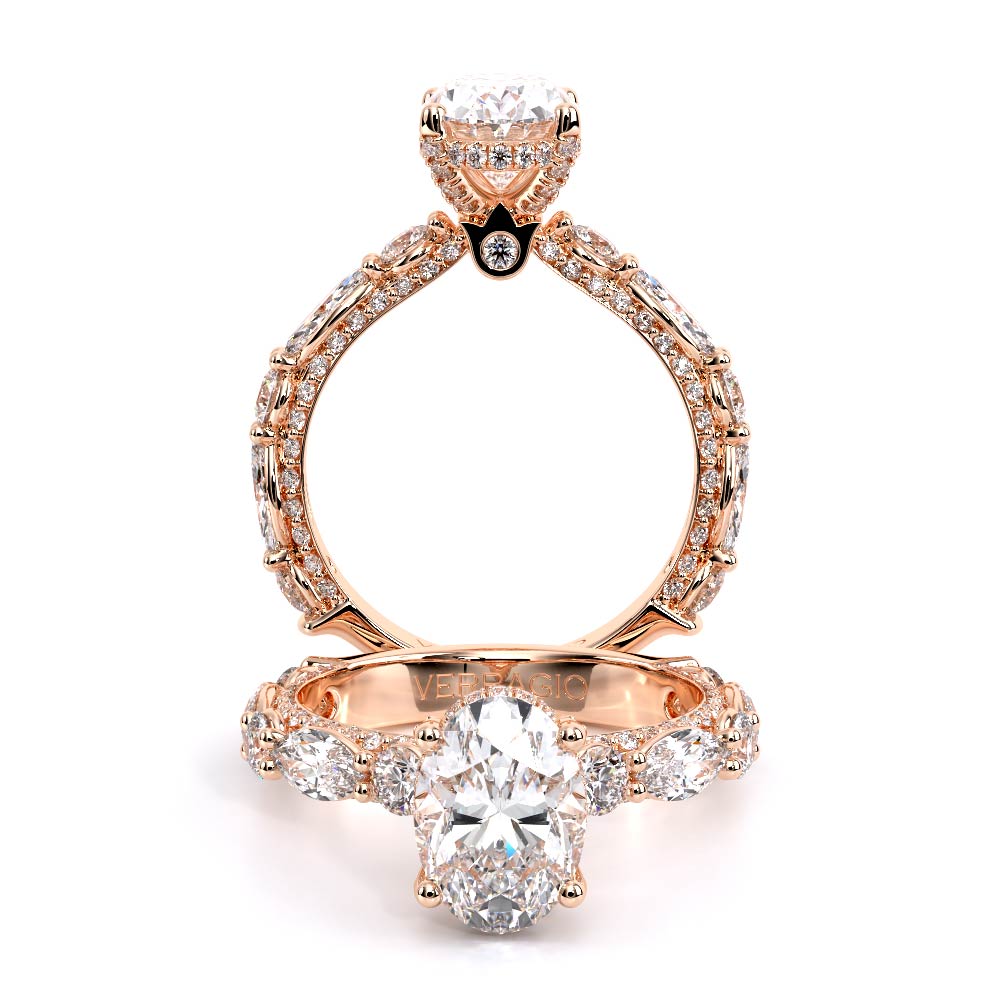 Couture-0490OV-3.0 is an elevated four-prong engagement ring featuring a diamond-bridge head designed to highlight your center stone. Meticulously-set alternating round and marquise diamonds in a shared-prong setting wrap the elegant shank, enhanced with a pave-set three-quarter diamond riviera. The Verragio signature crest completes the statement look.