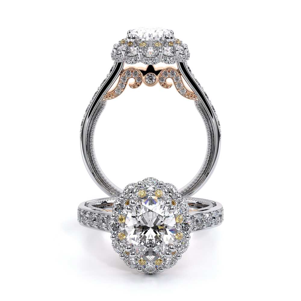 INSIGNIA-7106OV Features our prestigious Enchanted Diamond Halo creating a truly unique engagement ring designed to emphasize your oval diamond center. Verragio's timeless signature beading along side Insignia's handcrafted diamond scrollwork are all details adding to the beauty and lure of this ring.