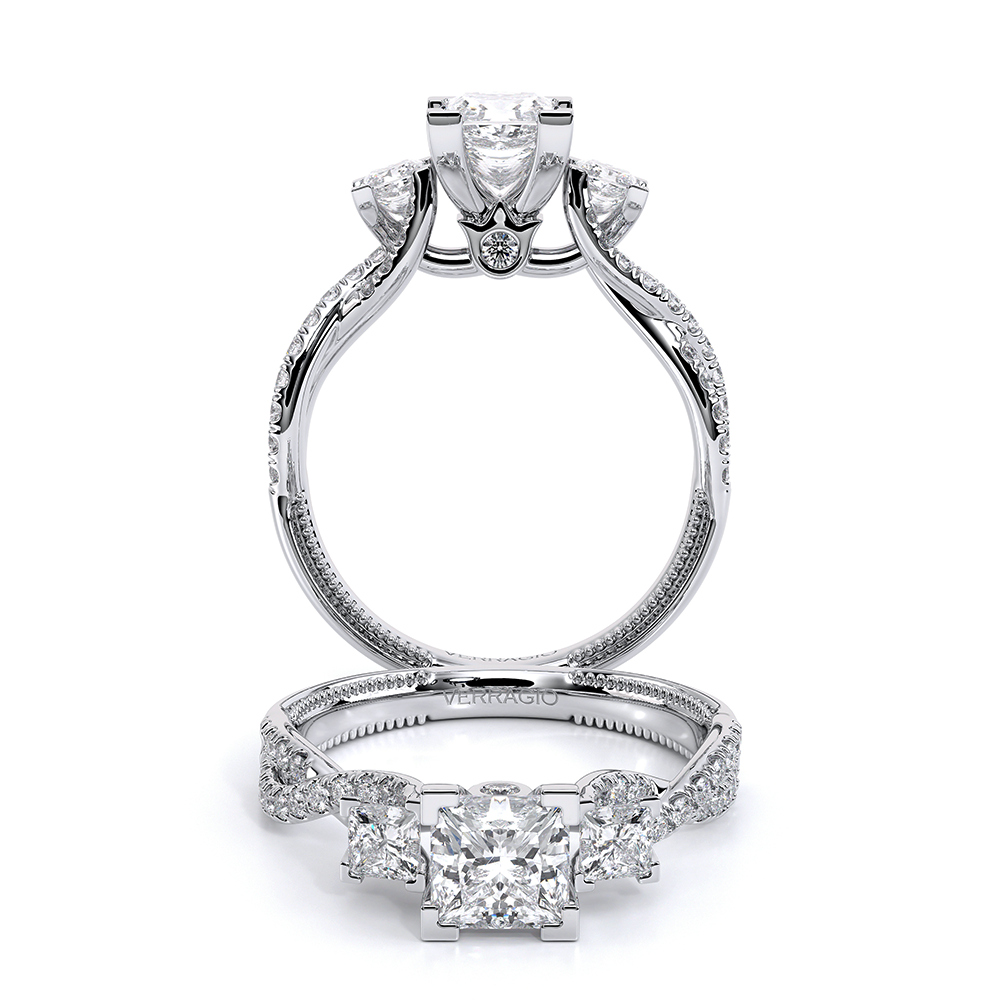 Renaissance-962-3P1.2 features three dazzling stones representing past, present, and future. The twisted shank adds modern elegance with its delicate diamonds. Milgrain detailing and the signature Verragio crest make this ring a symbol of timeless love and commitment.