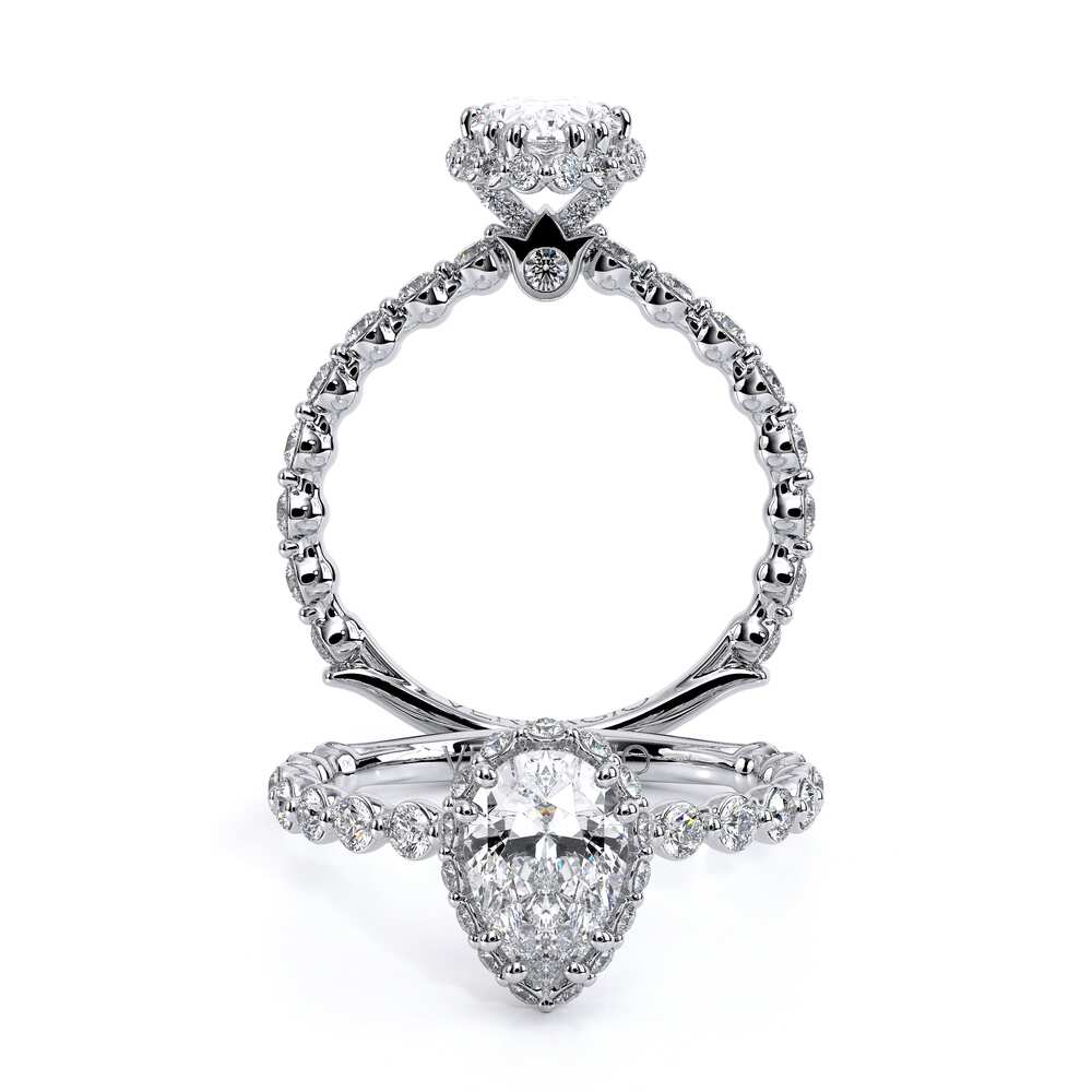 Renaissance-984-HPS2.0 accentuates your choice of center stone with our elegant Stardust halo. Brilliant round diamonds extending three quarters give this unique halo engagement ring extra sparkle.