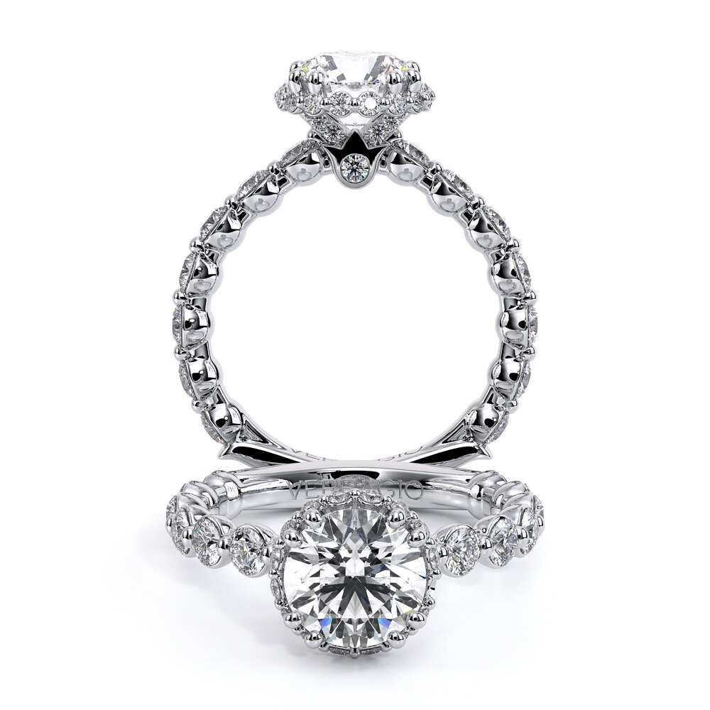 Renaissance-984-HR2.5 accentuates your choice of center stone with our elegant Stardust halo. Brilliant round diamonds extending three quarters give this unique halo engagement ring extra sparkle.