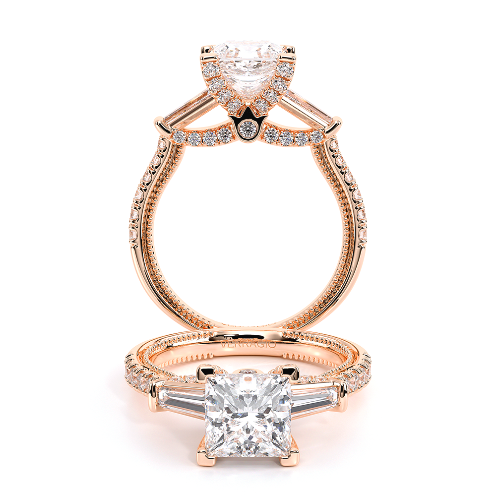 Renaissance-991P is a captivating three-stone engagement ring featuring baguette diamond side-stones. Pave diamonds beautifully frame your center stone; the diamond shank adorned with delicate milgrain detail elevates this ring with elegance. The Verragio signature crest completes the refinement of this piece.