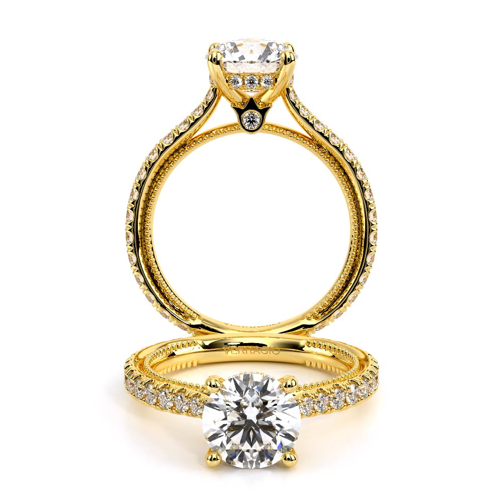 Renaissance-992R1.7 A classic four-prong engagement ring where timeless elegance meets contemporary flair. A unique diamond bridge elevates the center stone for added brilliance and the diamond-studded cathedral shank, featuring subtle milgrain detail, gives a touch of vintage charm. The Verragio signature crest completes the balance of classic and modern.