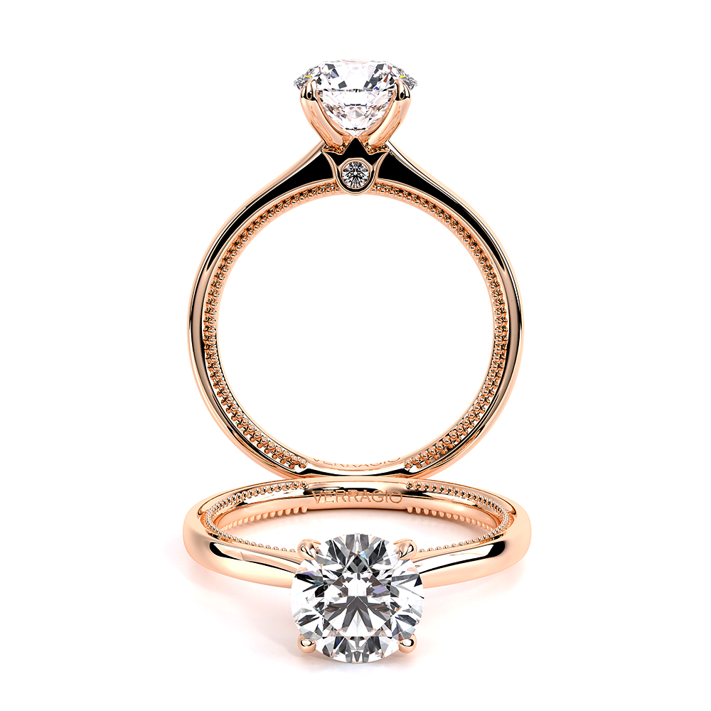 Renaissance-SOL301-R is a timeless engagement ring created for your perfect Round shaped center stone atop a high polish shank. This setting features an elegant and refined profile with Verragio's signature beading and crest.