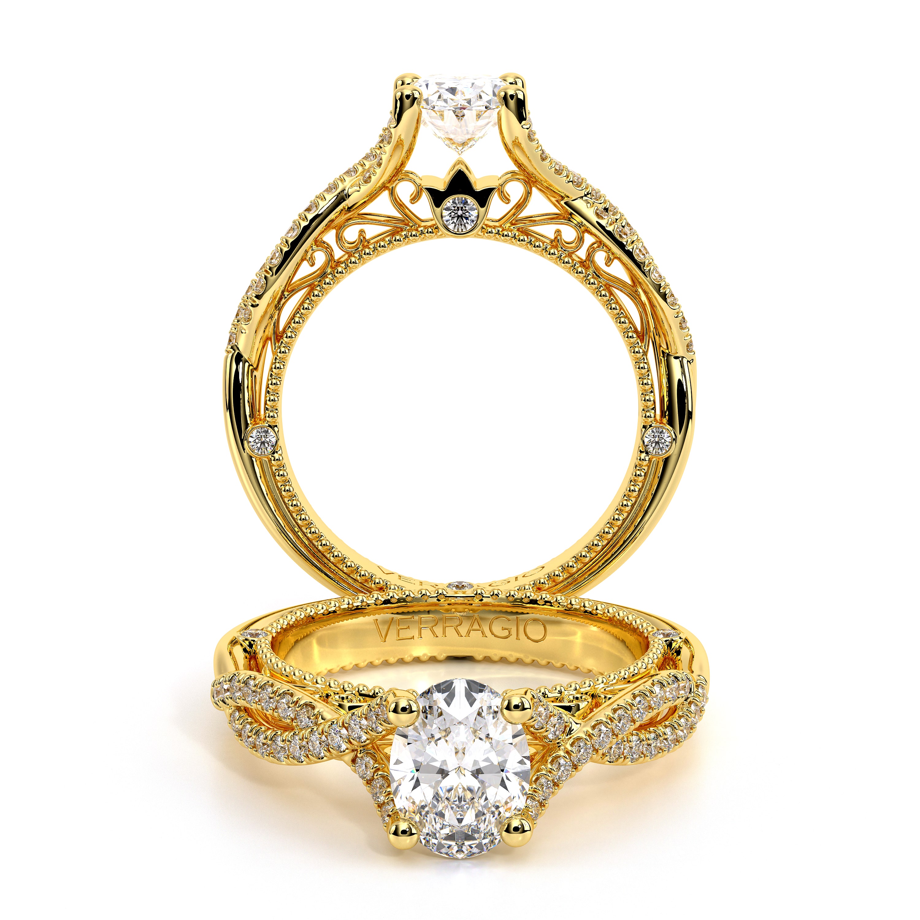 VENETIAN-5003 engagement ring features pave' set round brilliant-cut diamonds in a beautiful vintage style twisted shank. Personalize the ring to hold any diamond cut desired giving and illusion of a floating center. The handcrafted lace and Verragio signature beading completes the entire look of this classic piece.