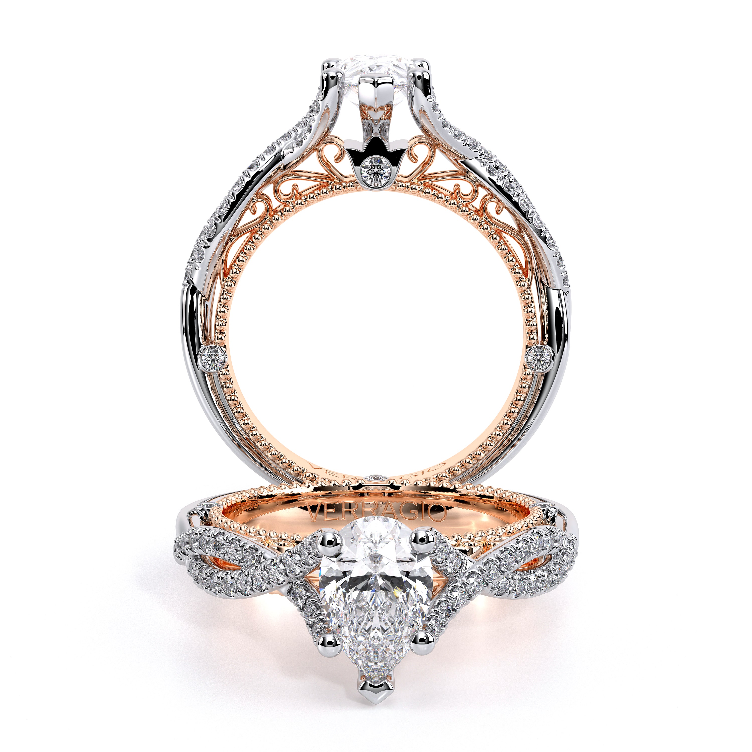 VENETIAN-5003 engagement ring from the Venetian Collection features round brilliant-cut diamonds pave set in a twisted shank enhancing any center shape of your choice in a floating design. Our beautiful Venetian lace and Verragio signature beading completes this vintage piece.