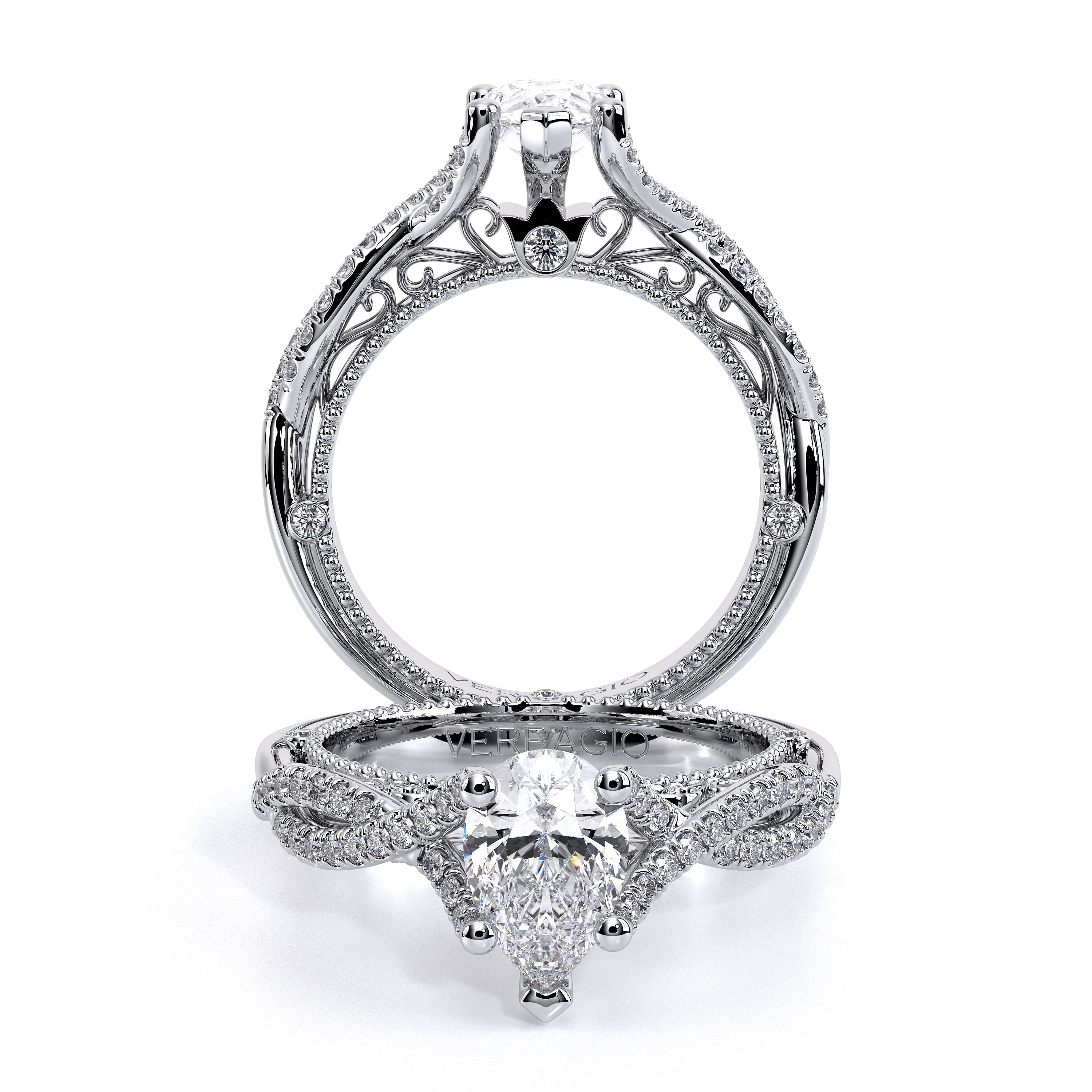 VENETIAN-5003 engagement ring from the Venetian Collection features round brilliant-cut diamonds pave set in a twisted shank enhancing any center shape of your choice in a floating design. Our beautiful Venetian lace and Verragio signature beading completes this vintage piece.