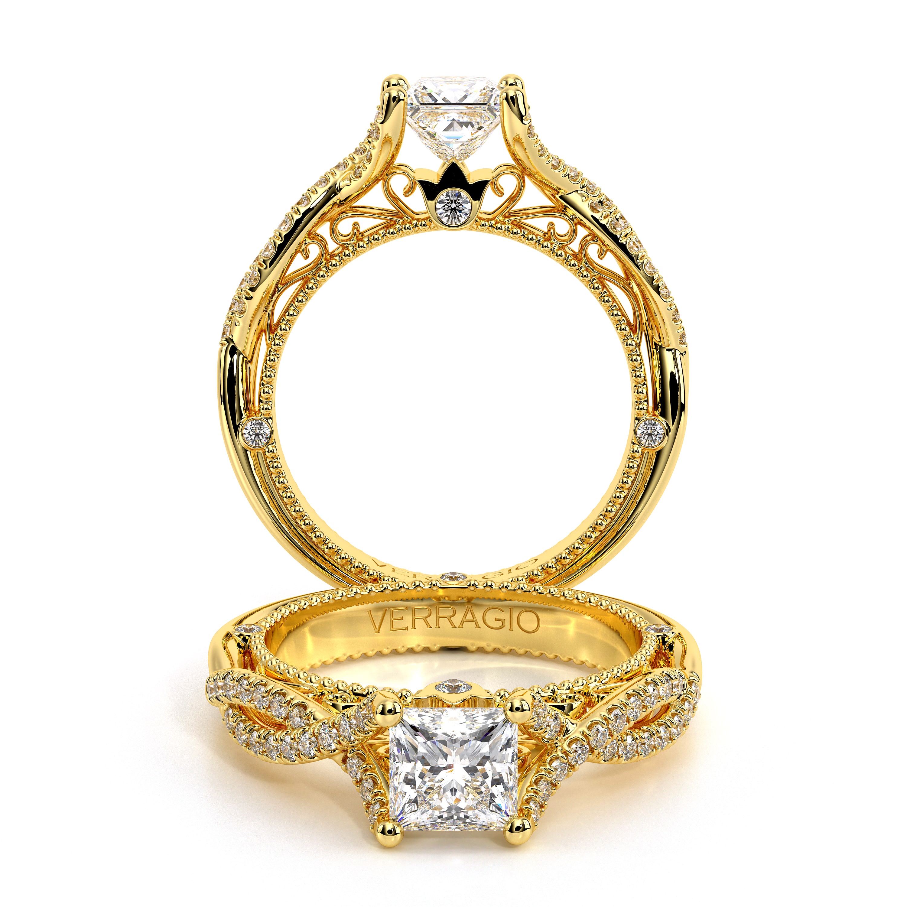 VENETIAN-5003 engagement ring from the Venetian Collection features a pave' set diamond twisted shank showcasing handcrafted lace and Verragio signature beading. This beautiful vintage four-prong setting gives an illusion of a floating center stone and can accommodate almost any diamond cut desired.