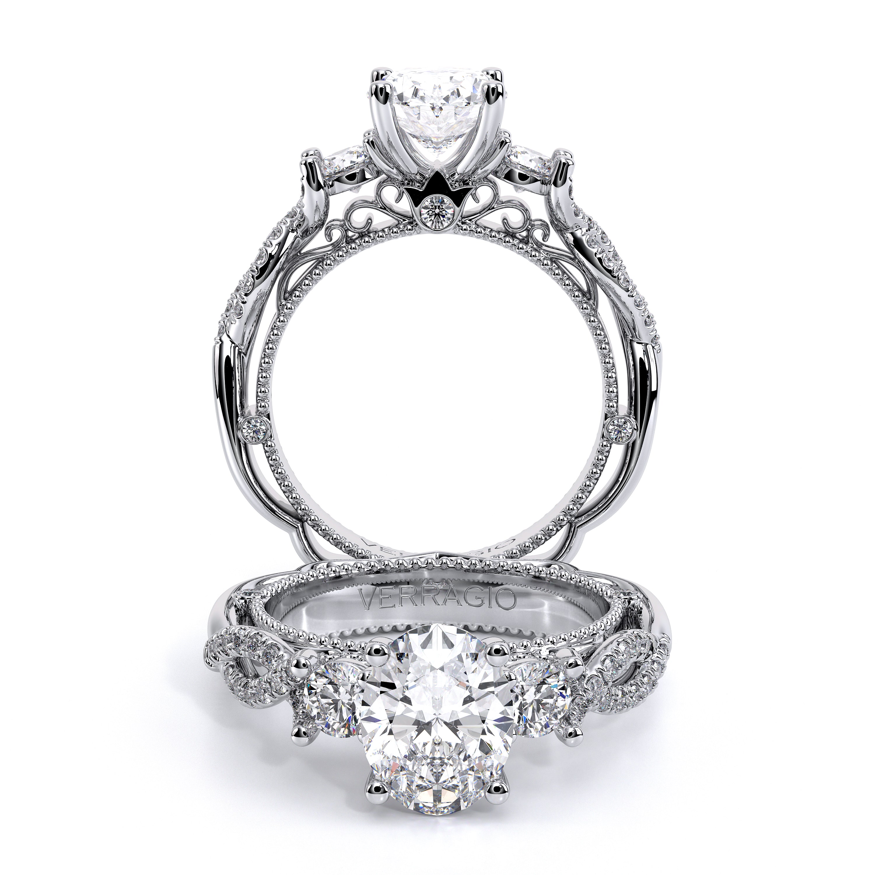 VENETIAN-5013OV features a three stone diamond engagament ring with two round side diamonds seemlesly integrated on a twisted diamond shank. The inner profile showcases beautifully handcrafted lace and our Verragio signature beading. Personalize this beauty with a center stone shape of your choice.