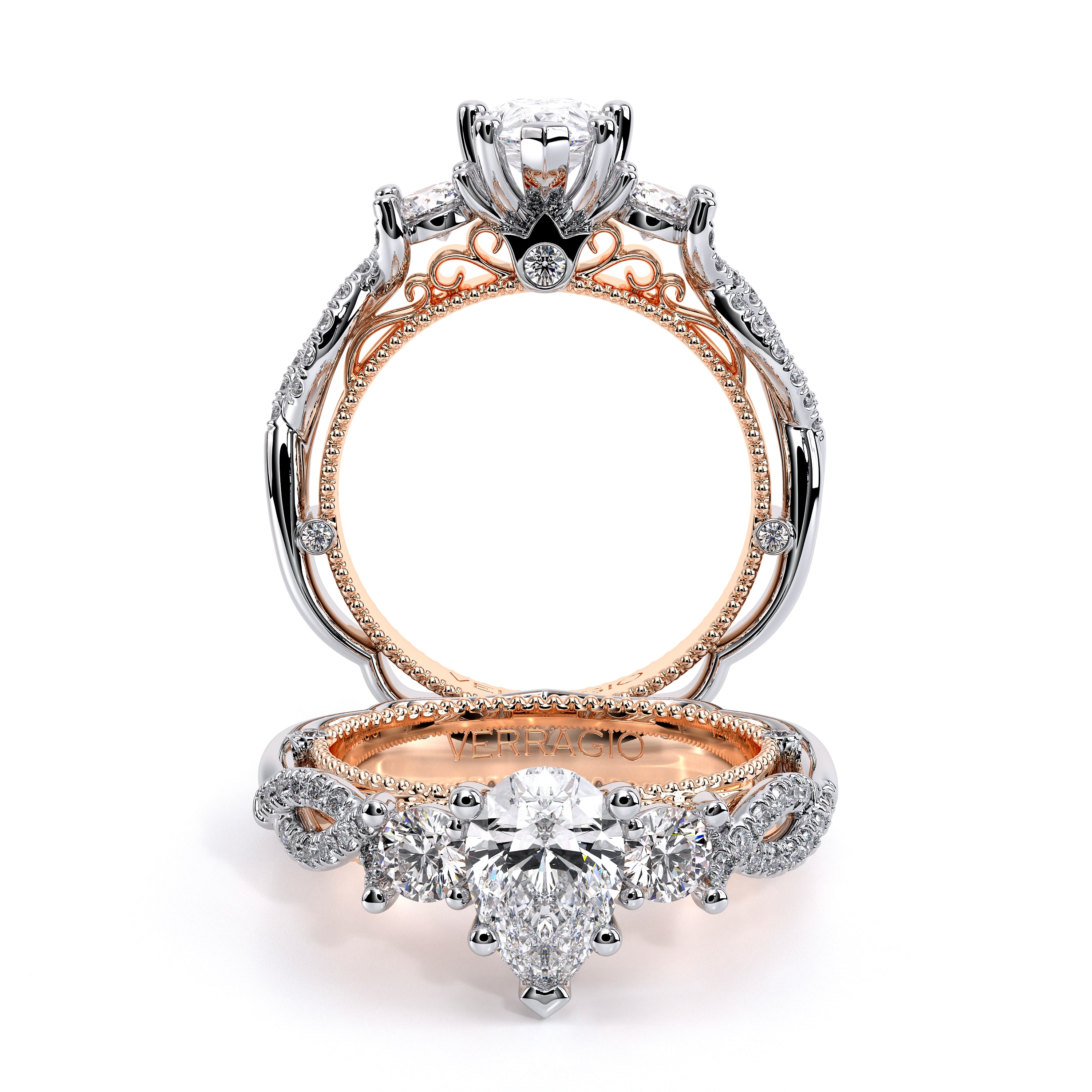 VENETIAN-5013PEAR is a three stone diamond engagament ring featuring two round side diamonds seemlesly integrated on a twisted diamond shank. The inner profile showcases a handcrafted lace and our Verragio signature beading. Personalize this beauty with a center stone shape of your choice.