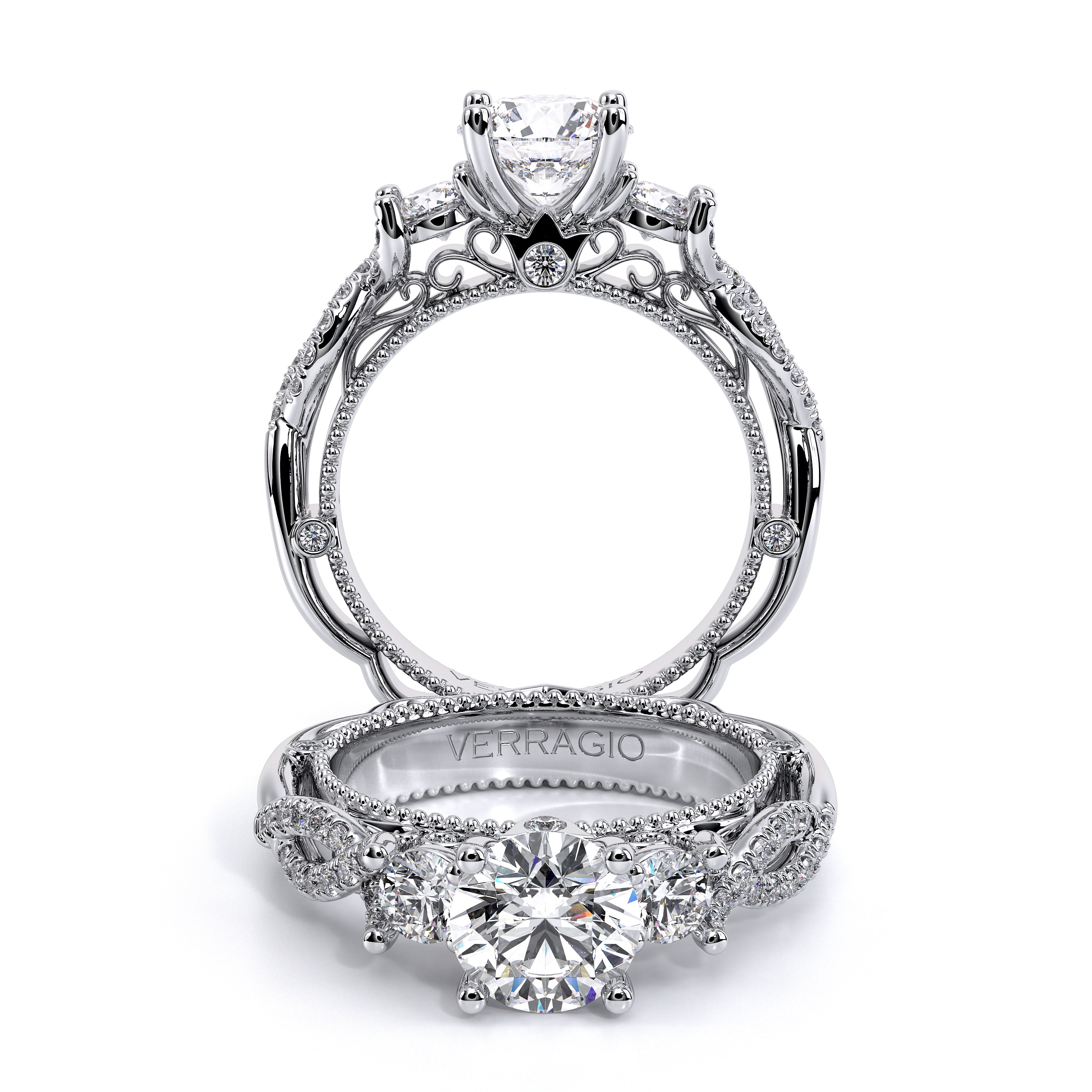 VENETIAN-5013R is a classic representation of a three stone diamond engagement ring. Featuring two round side diamonds seemlesly integrated on a twisted diamond shank. The beautiful handcrafted lace and Verragio signature beading completes this stunning piece of art.