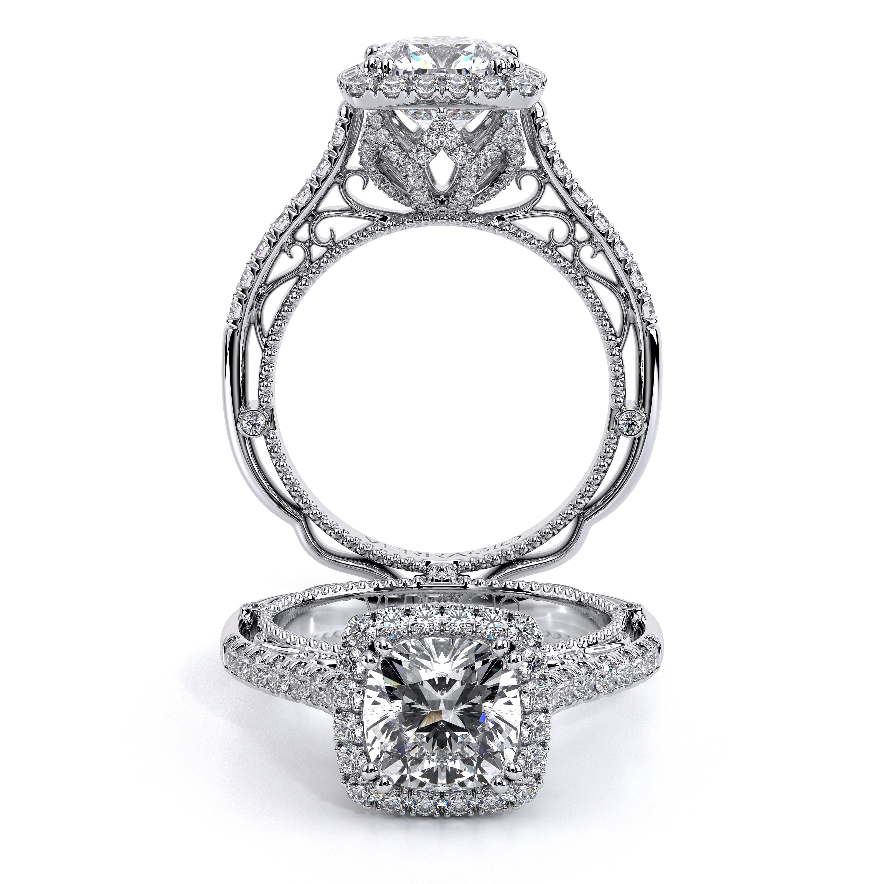 VENETIAN-5061CU engagement ring from the Venetian Collection features a unique diamond adorned basket in rose gold topped with a cushion shaped single halo made for a round center. A delicate straight shank encrusted with round brilliant diamonds completes this beautiful ornate design.