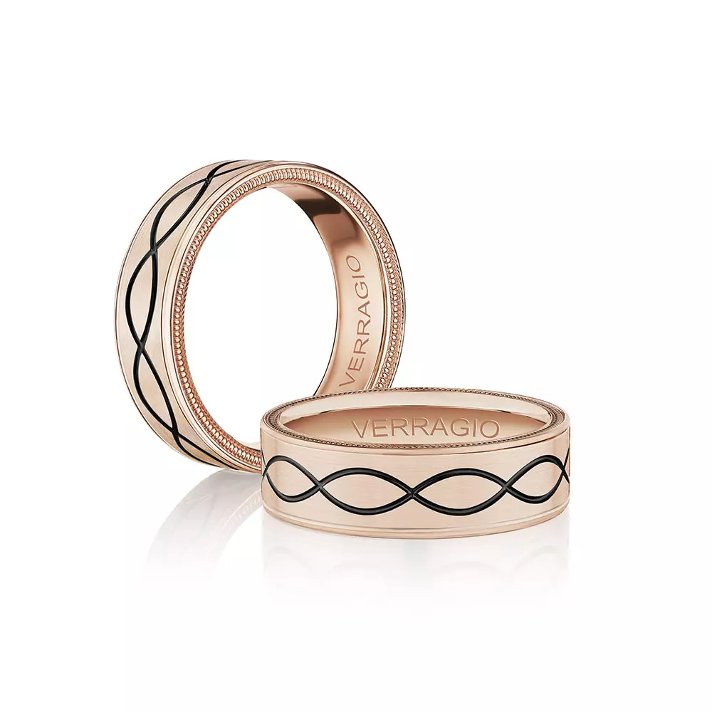 VWB-7013-RWR is our unique 7MM men's band with the symbol of eternal love. Black rhodium is etched into the heart of the ring as it intertwines while showcasing Verragio signature rose gold beading along the edges.