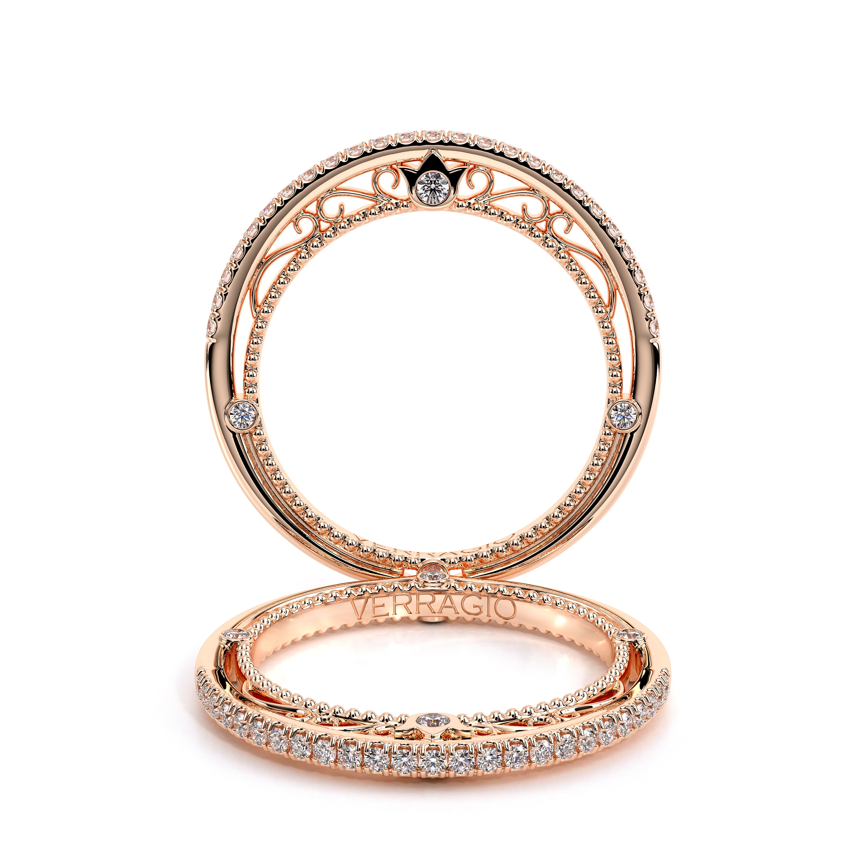VENETIAN-5003WSB from the Venetian Collection features an intricate straight band set with round brilliant diamonds. The inner profile showcases a beautiful handcrafted lace and our signature beading. Make it yours in two-tone or all one color to match your Verragio engagement.