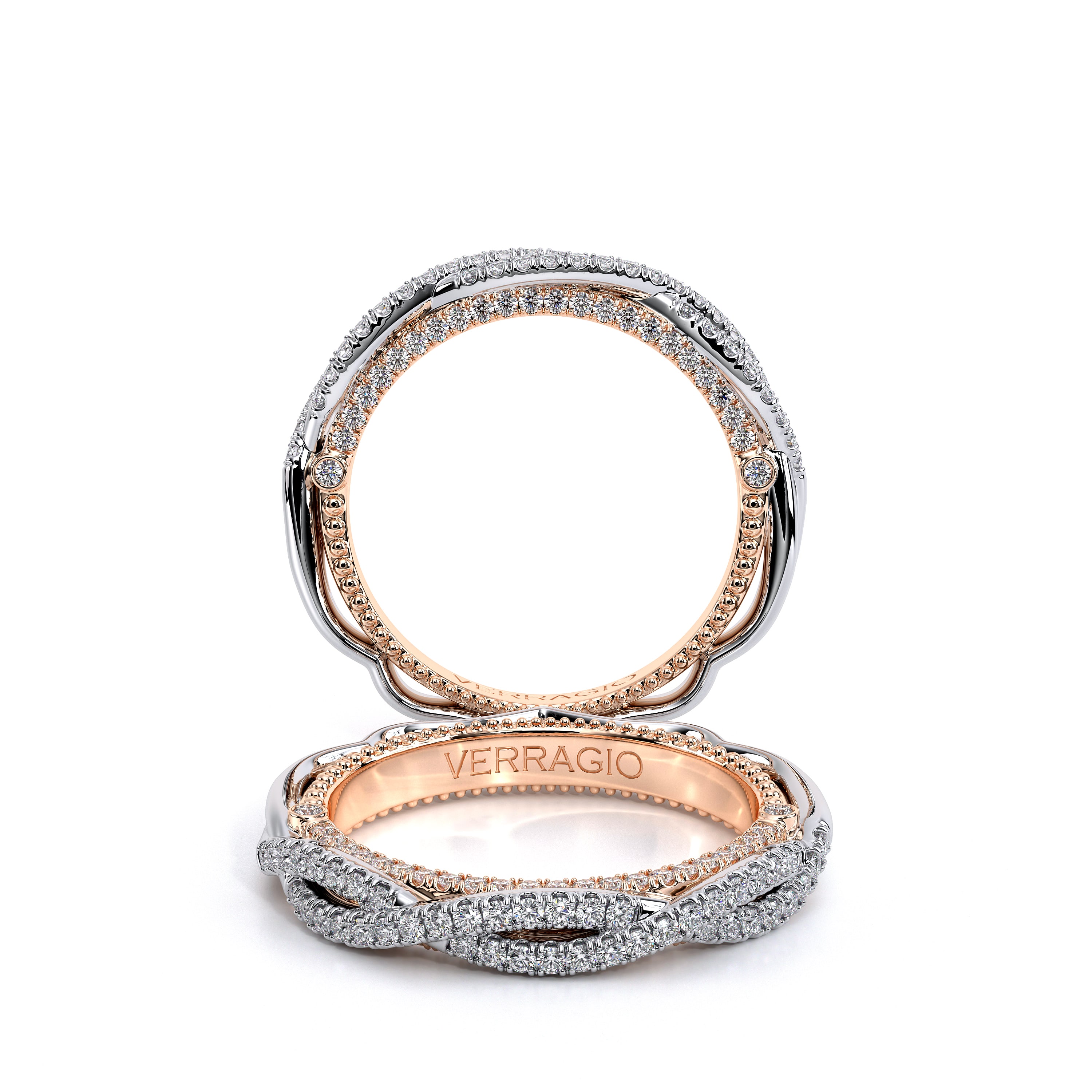 VENETIAN-5069W from the Venetian Collection features a stunning twisted band encrusted with round brilliant diamonds. The inner profile showcases a sparkling stardust inlay laced with two bezel set round diamonds each side along with our signature beading. Compliment your Verragio engagement ring by choosing a twisted or a straight band.
