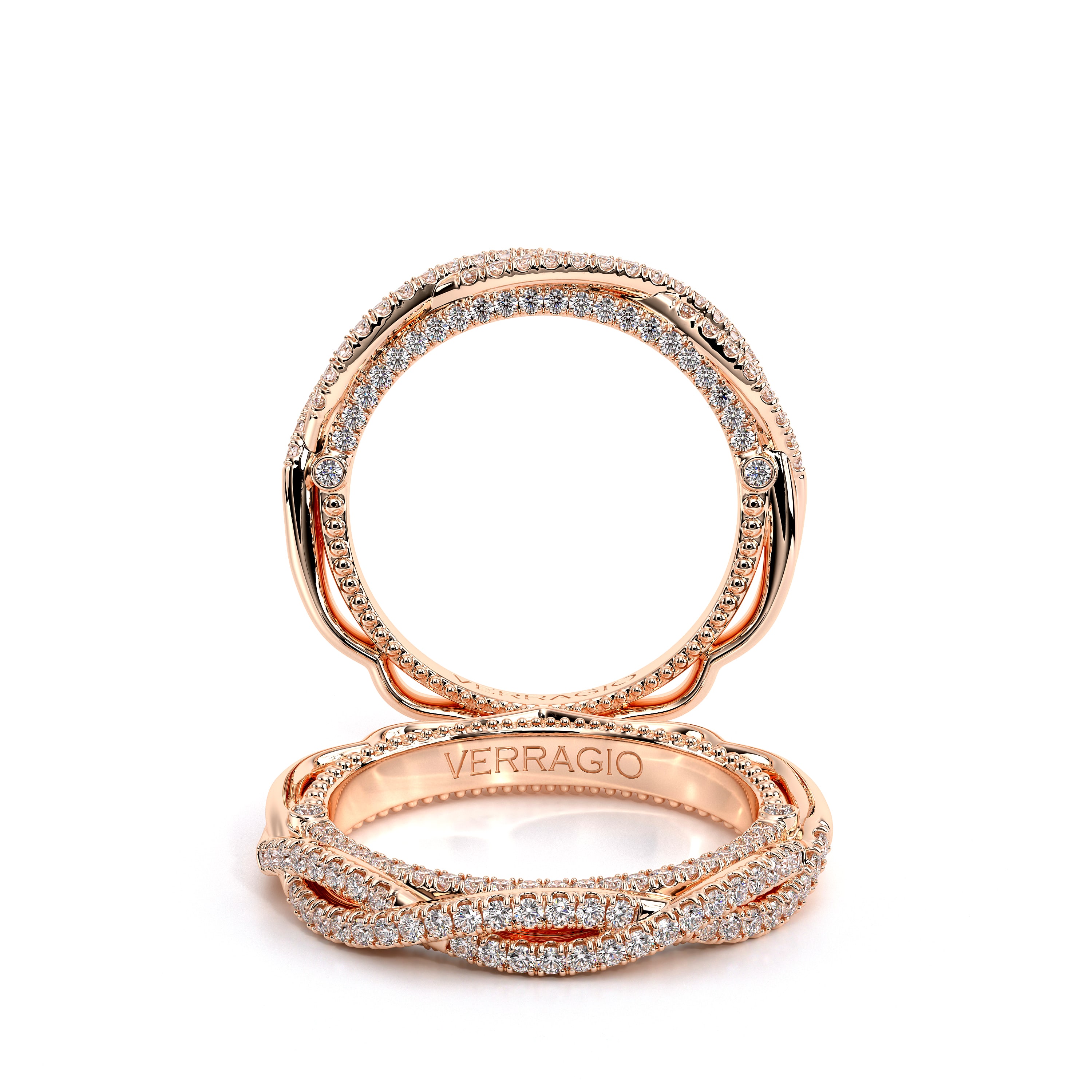 VENETIAN-5069W from the Venetian Collection features a stunning twisted band encrusted with round brilliant diamonds. The inner profile showcases a sparkling stardust inlay laced with two bezel set round diamonds each side along with our signature beading. Compliment your Verragio engagement ring by choosing a twisted or a straight band.