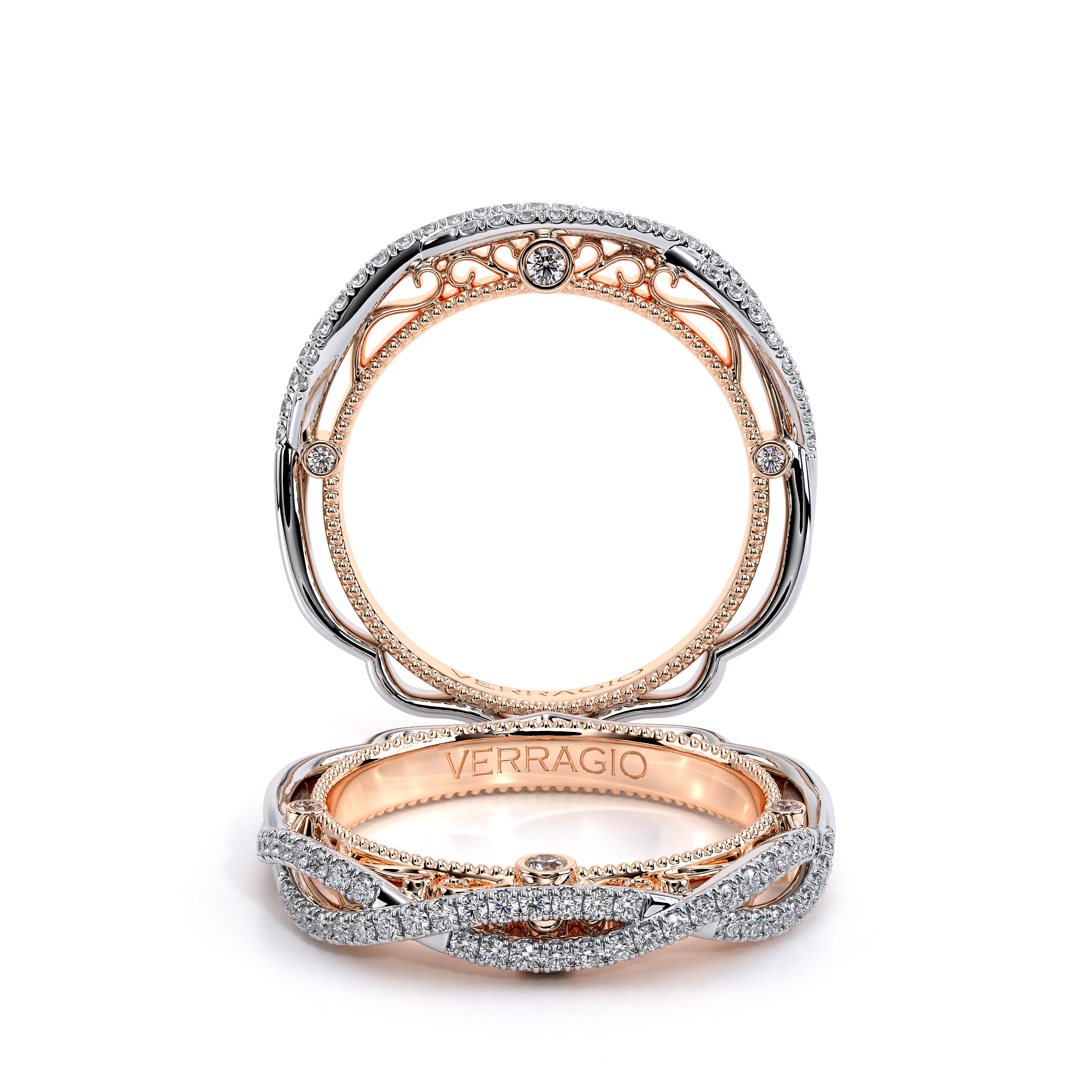 VENETIAN-5078W from the Venetian Collection features an intricately designed twisted wedding band with round brilliant diamonds. The inside profile is flawlessly laced with three bezel set round diamonds and our signature beading. You can opt for a twisted or straight wedding band to compliment your Verragio engagement ring.
