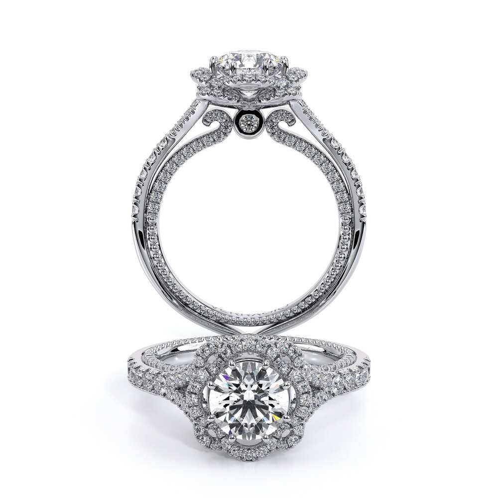 COUTURE-0444R One of a Kind Double Floret Engagement ring that features a pave set cathedral diamond band the subtle sparkle of our half diamond Riviera adorned with the Verragio Crest and our Verragio Signature Beading completed with the Couture shank.