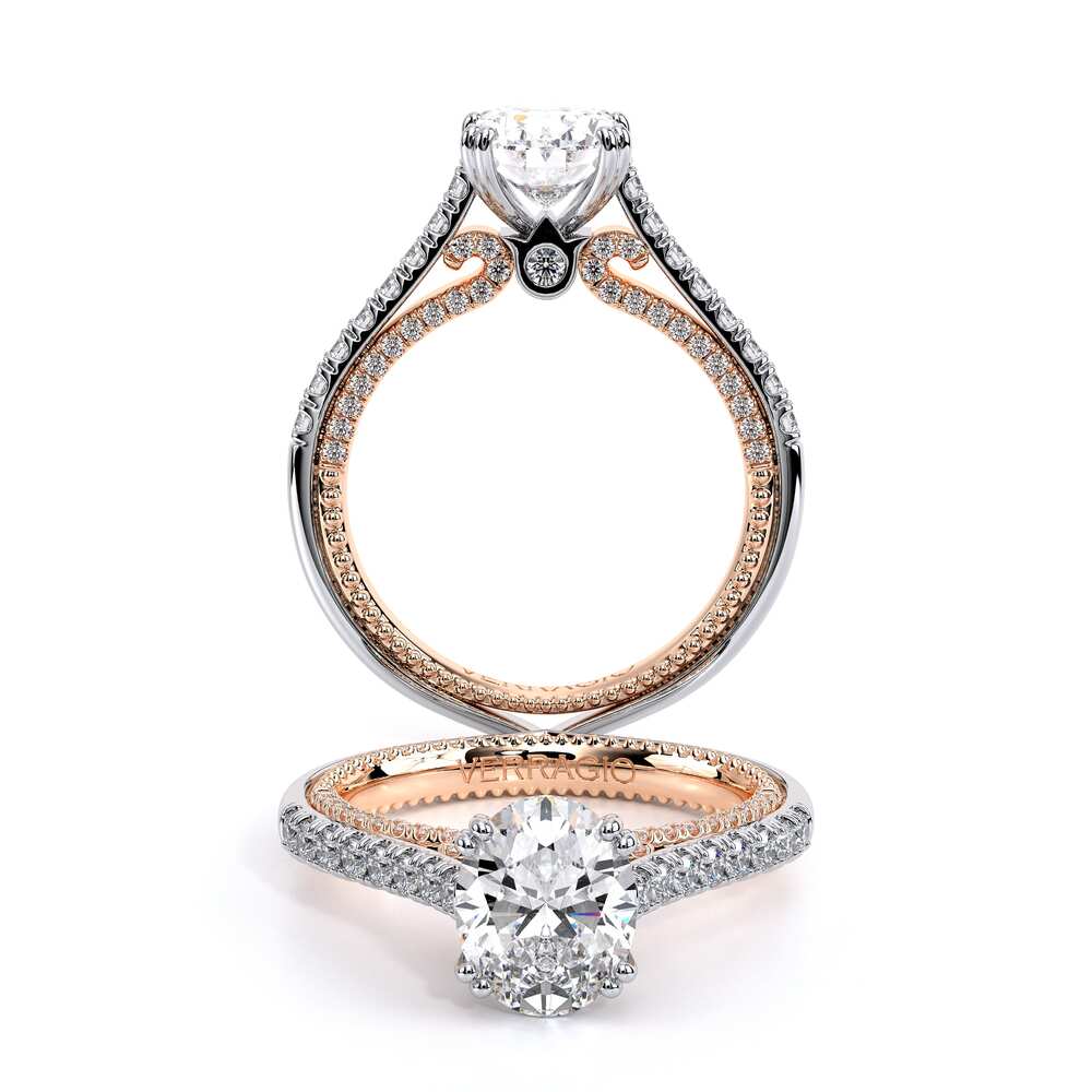 COUTURE-0452OV Classically simple Oval Engagement ring that features a pave set cathedral diamond band the subtle sparkle of our half diamond Riviera adorned with the Verragio Crest and our Verragio Signature Beading completed with the Couture shank.