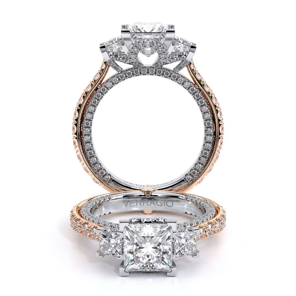 COUTURE-0479P is our new Three Stone Engagement ring highlighting our meticulously set diamond bridge elevating the surrounding princess side stones. With the addition of our 3/4 Diamond Riviera and Verragio's signature crest the radiance of this style is unlike any other.