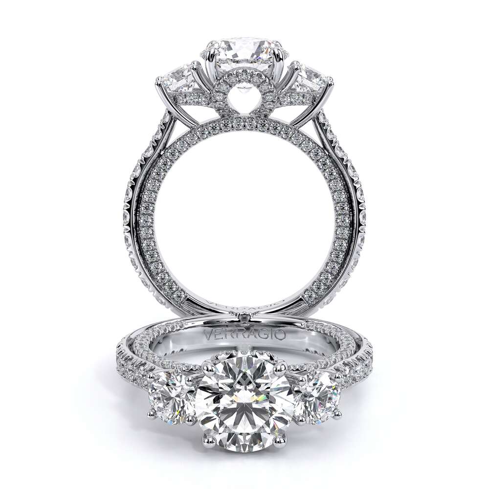 COUTURE-0479R is our new Three Stone Engagement ring highlighting our meticulously set diamond bridge elevating the surrounding round side stones. With the addition of our 3/4 Diamond Riviera and Verragio's signature crest the brilliance of this style is unlike any other.