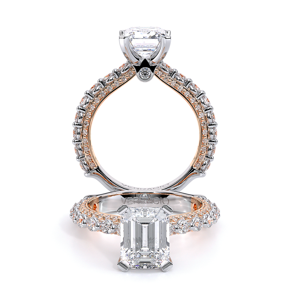Couture-0488EM20 is an elevated four-prong engagement setting designed to highlight your center stone. Meticulously-set round diamonds in a shared-prong setting wrap the elegant shank, enhanced with a pave-set three-quarter diamond riviera. The Verragio signature crest completes the statement look.