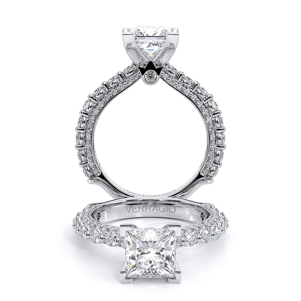 Couture-0488P20 is an elevated four-prong engagement setting designed to highlight your center stone. Meticulously-set round diamonds in a shared-prong setting wrap the elegant shank, enhanced with a pave-set three-quarter diamond riviera. The Verragio signature crest completes the statement look.
