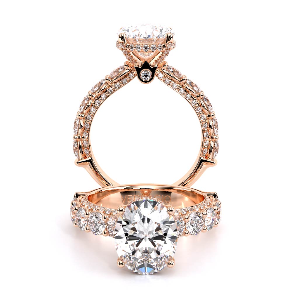Couture-0489OV-3.4 is an elevated four-prong engagement ring featuring a diamond-bridge head designed to highlight your center stone. Meticulously-set round diamonds in a shared-prong setting wrap the elegant shank, enhanced with a pave-set three-quarter diamond riviera. The Verragio signature crest completes the statement look.