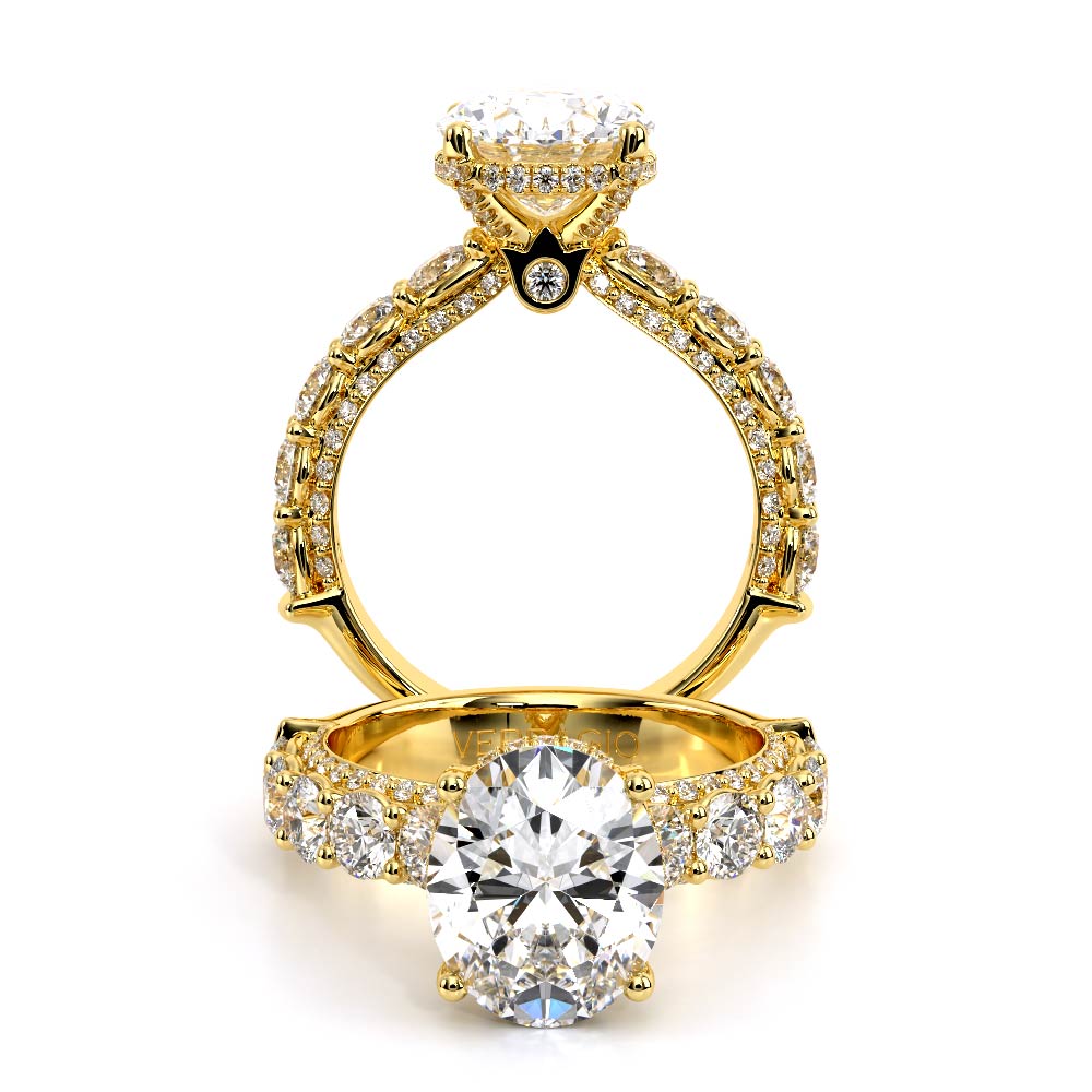 Couture-0489OV-3.4 is an elevated four-prong engagement ring featuring a diamond-bridge head designed to highlight your center stone. Meticulously-set round diamonds in a shared-prong setting wrap the elegant shank, enhanced with a pave-set three-quarter diamond riviera. The Verragio signature crest completes the statement look.