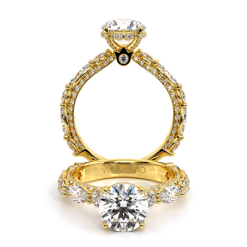 Couture-0490R-3.0 is an elevated four-prong engagement ring featuring a diamond-bridge head designed to highlight your center stone. Meticulously-set alternating round and marquise diamonds in a shared-prong setting wrap the elegant shank, enhanced with a pave-set three-quarter diamond riviera. The Verragio signature crest completes the statement look.