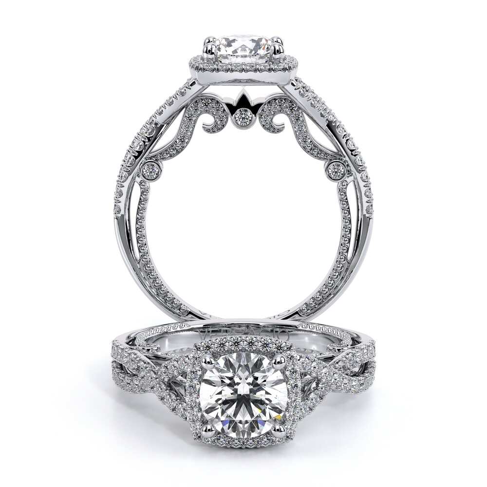 INSIGNIA-7070CU Cushion halo engagement ring. Featuring timeless pave' set round brilliant-cut diamonds on a twisted shank accompanied by Verragio's signature beading and crest.