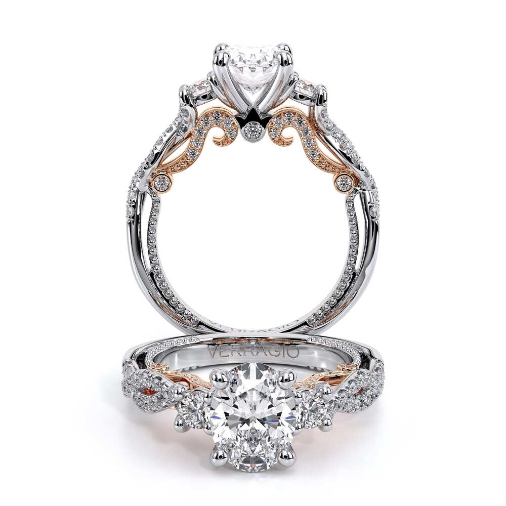 INSIGNIA-7074OV Three stone diamond engagement ring adorned with Verragio's signature beading pave set brilliant-cut diamonds on Insignia's handcrafted scrollwork and twisted band. Refined to enhance a Oval diamond center.