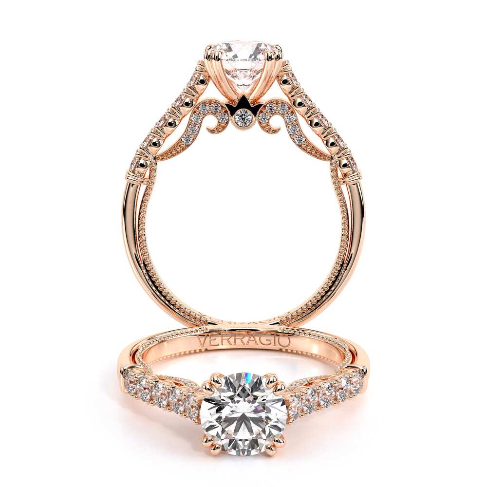 INSIGNIA-7097R Classic engagement ring features a shared-prong set band with round brilliant-cut diamonds. Meticulously set and handcrafted is Insignia's scrollwork which seamlessly flows into Verragio's signature beading and crest.